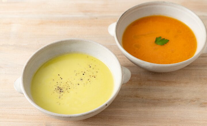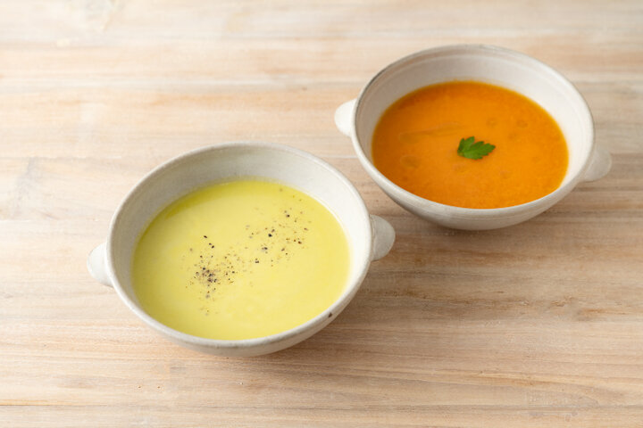 (写真左)たまねぎスープ(写真右)じゃがいもチーズポタージュ