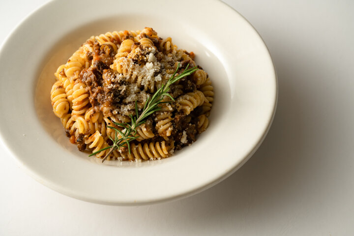 三重県松阪市にある手作りパスタ専 門店の看板メニュー。香味野菜は揚げ焼きに、パルミジャーノの皮やポルチーニを隠し味に加えるなど細かいひと手間の組み合わせで、松阪牛の旨み際立つ極上の味を実現。フジッリ&粉チーズ付き。