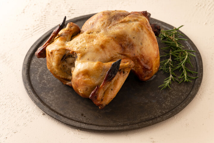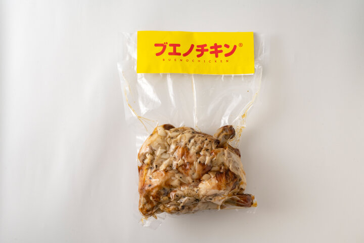 新鮮な沖縄県産のやんばる若鶏を秘伝のタレに2 日間漬け込み、90分かけてロースト。にんにく1玉を粗みじん切りしてお腹に詰め込み、お酢やハーブ で味つけしました。湯煎だけで、ジューシーな質感と鶏肉の旨みが際立つ焼き立ての美味しさに。