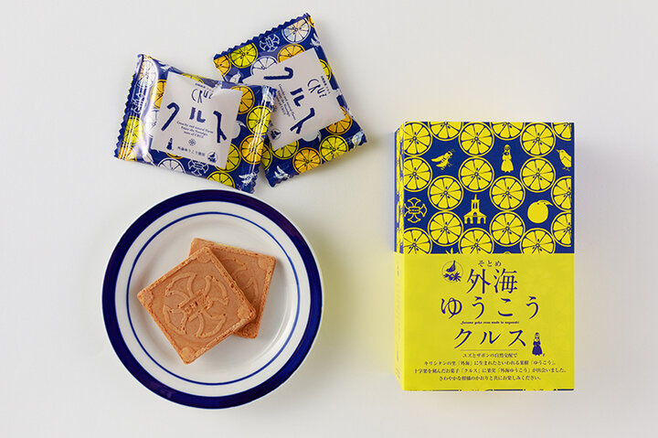 長崎みやげとして愛されている「クルス」。パリッとした「湯せんぺい」の製法をベースにしたこくのあるホワイトチョコレートをサンドしたクルスは、何枚でも食べられそうなあっさりした甘さのお菓子です。 「外海(そとめ)ゆうこうクルス」は、長崎の伝統柑橘である、ゆうこうを使ったフレーバー。ゆうこうは、潜伏キリシタンと深く関わりのある「外海」地区に多く自生していたとされる、ゆずとザボンが自然交配してできた果実です。「ゆうこうクルス」では果肉より果汁を生かそうと、乾燥させた果汁をホワイトチョコレートと混ぜ合わせて開発したのだそう。ほのかな酸味と香りがさわやかな味わいを生んでいます。