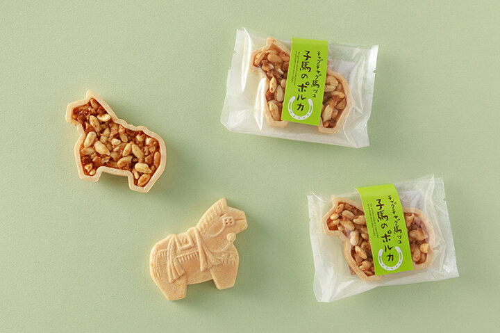 岩手で毎年6月の第2土曜に行われる「チャグチャグ馬コ」をご存じですか?色鮮やかな装束をまとった約100頭の農耕馬が、滝沢市の鬼越蒼前神社から、盛岡市中心部の盛岡八幡宮まで行進する伝統行事です。 「子馬のポルカ」は、春に生まれた可愛い子馬が、母と一緒に参加し、沿道を軽やかに走る愛らしいイメージから誕生したお菓子。クルミと岩手県滝沢産のおいしいお米のパフ、キャラメルを香ばしく絡め焼き上げたフロランタンです。馬の形を模した最中のサクッとした食感とのバランスも良く、軽やかに食べられます。