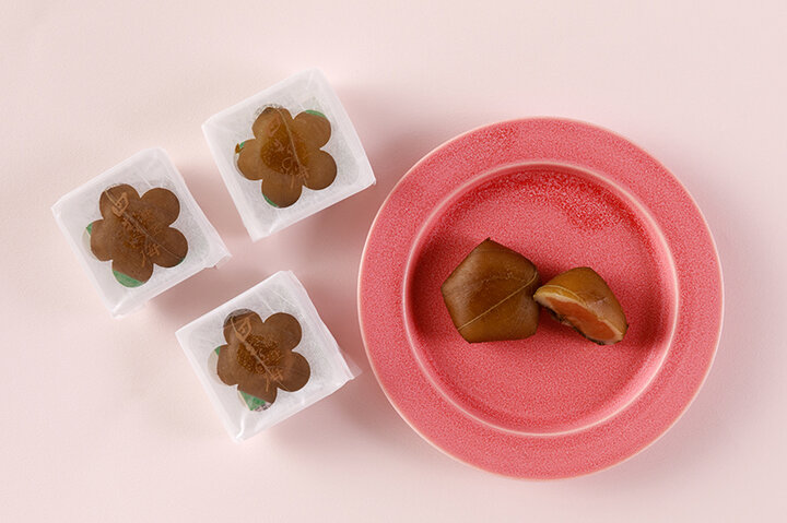安土桃山時代ごろに伊達藩から伝わった餅文化が受け継がれている、岩手県の一関・平泉エリア。食事からおやつまで、さまざまにアレンジした餅が日常的に食べられています。 一関市で明治時代から餅菓子を作り続けている「松栄堂」の「献上田むらの梅」は、国産の梅を使った梅餡を餅生地で包み、青紫蘇で手包みした和菓子。梅の花弁の五角形を表現した形をしています。甘く爽やかな梅の香りと、3ヶ月塩に漬けた紫蘇の葉の香りが上品です。白あんベースの梅餡は酸味というよりも甘酸っぱいというべき味わいで、緑茶やほうじ茶ともよく合います。