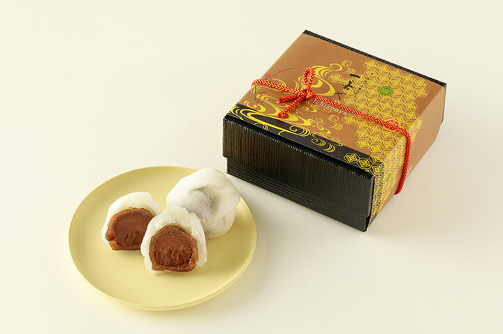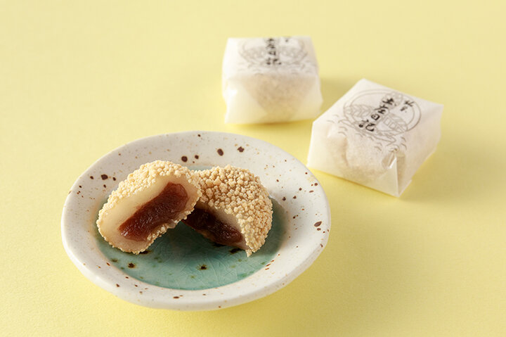 平安時代に紀貫之が帰京するまでを綴った旅日記『土左日記』。その旅日記の名前を付けた「土左日記」は、上品な味わいの餅菓子です。 包みを開いて小麦色のそぼろをまとったお菓子を口に運ぶと、もっちりしたお餅と上質な餡の組み合わせでほっとする時間を過ごせます。こちらの餅菓子の特徴は、表面にまぶされた寒梅粉。お餅が指にくっつかないので食べやすくなると同時に、食感のアクセントにもなっています。独自製法で作られているそうで、香ばしく素朴な風味が楽しめますよ。