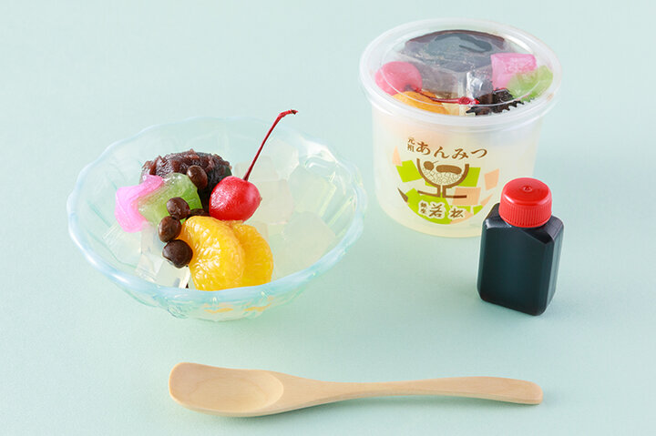「あんみつ」の発祥は昭和5年、銀座の中央通りにある甘味処「銀座若松」。今でも、店内で食べるほか、おみやげとして持ち帰ることもできる人気のメニューです。 プリプリのと歯ごたえのある寒天、ほのかな塩気の赤えんどうに、香りが良い黒蜜をかけて食べるとあっさりした甘さ。あんこの甘さは控えめで食べやすく、サクランボやミカン、桃色と若草色の求肥が彩りを加えてます。