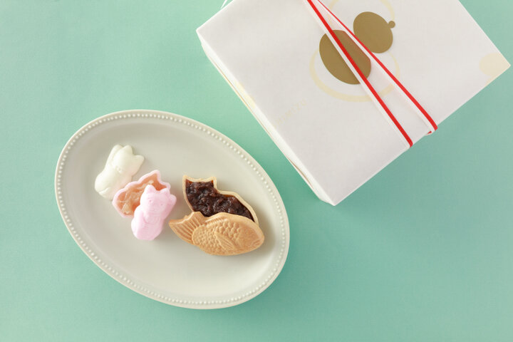 湘南にあるフレンチレストラン「 KUGENUMA SHIMIZU」。メニューに旬の食材を取り入れることから、日本の食材にも馴染みがあったそう。帝国ホテルでの経験を持つシェフが、食に対する探究心から料理のみならず和と洋を融合したスイーツも考案しています。 「銀座限定 幸」は古くから縁起がよいとされるモチーフをふんだんに取り入れた最中のセット。鯛、招き猫や松竹梅を描いた末広がりの扇、だるまなど、縁起ものを7種を象った最中種。あんこは自分で挟む別包装タイプになっているので、食べるときはいつでもできたて。香ばしい香りでパリパリっと軽い食感の最中と口当たりなめらかなあんが好バランスです。あんは十勝小豆と手芒種の2種類があり、どちらもしっとりほくほくのおいしさです。