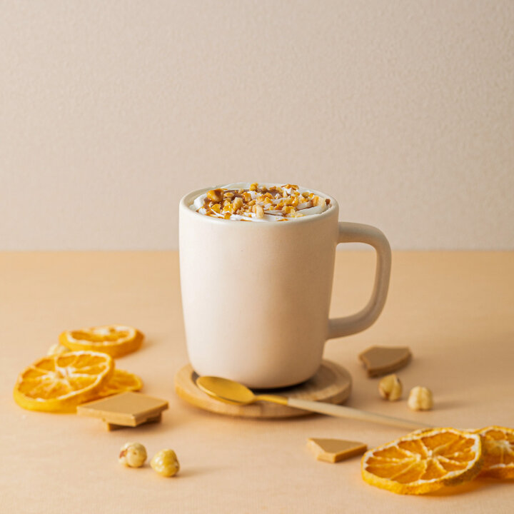 独特の「コク」と「香ばしさ」が多くのパティシエを魅了している“ブロンドチョコレート”。 「キャラメル&ヘーゼルナッツホットチョコレート」は、そのブロンドチョコにヘーゼルナッツやダークチョコレートを合わせ、絶妙な味わいに仕上げた贅沢なチョコレートドリンクです。 キャラメルソースやクリーム、オレンジピール、ヘーゼルナッツがトッピングされています。