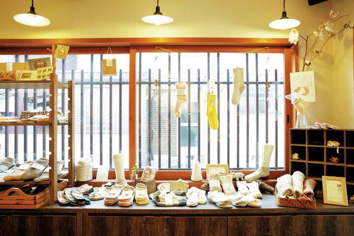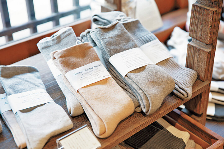 奈良県広陵町の靴下メーカーが手掛ける直営店。オーガニックコットンを中心に、麻やヤクの毛など自然素材から仕立てた靴下が並びます。
