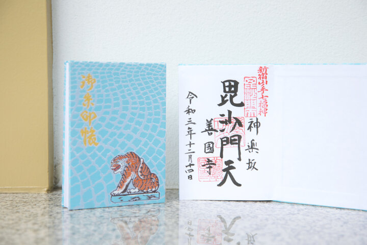 オリジナルデザインの御朱印帳にも虎が施されています。神楽坂の石畳をイメージした背景に虎が描かれており、裏面には毘沙門天像が。色はブルーとピンクの2色。寺務所で御朱印をもらえば、さらに虎の力強いパワーがいただけそうです。ほかに黄色と朱色の御朱印帳1200円もあり、こちらも虎を連想させる色合いになっています。