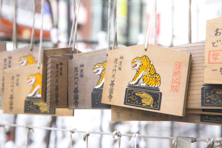 絵馬には本堂前に鎮座している狛虎が描かれています。力強く描かれた虎が、願い事の成就に力を貸してくれそうです。 毘沙門天 善國寺は新宿界隈にある、太宗寺、稲荷鬼王神社、永福寺、厳嶋神社、法善寺、経王寺と共に、新宿山ノ手七福神の一つにも数えられています。七福神めぐりをすると七つの福運を受けられると言われ、挑戦する人も多いとか。7箇所それぞれの距離も近く、電車を使えば約1時間半程度ですべてを周ることができるので、この機会に巡ってみるのもおすすめですよ。