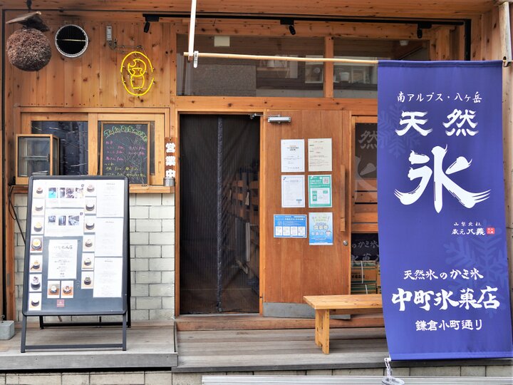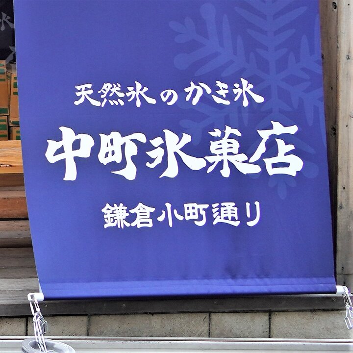 一年中ふわふわのかき氷が楽しめる「中町氷菓店 鎌倉小町通り店」。長野県松本市に本店のある天然氷のかき氷専門店で、小町通りと段葛の間の立ち寄りやすい場所にあります。紺地に白抜きした大きな“氷”の文字が目印です。
