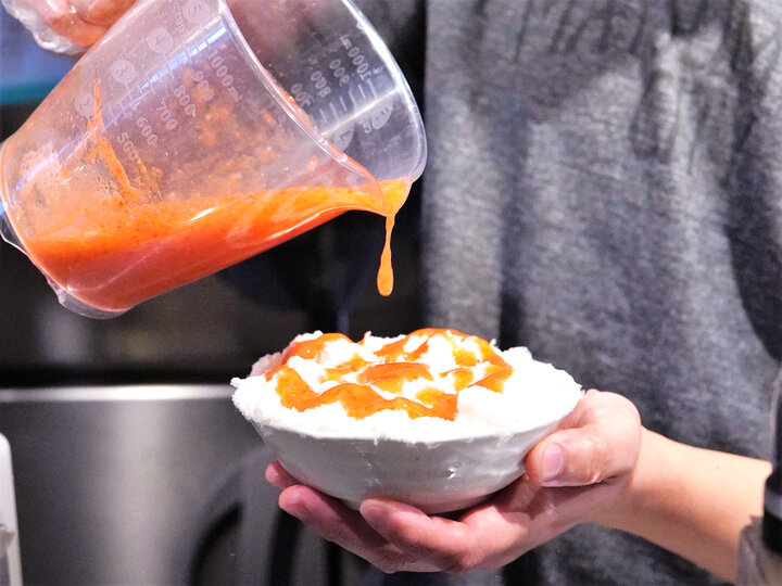 ある程度削ったところで特製練乳とイチゴ果汁を交互に惜しみなくかける
