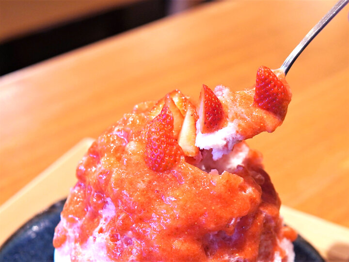 イチゴはオーダーが入ってからブレンダーでジュース状にする果汁100%、風味や香りがより豊かに味わえます。氷を削りながら特製練乳とイチゴ果汁をかけることを3回繰り返し、どこにスプーンを入れても果実感たっぷり。ふんわりと口の中でとろける氷と甘いイチゴの優しい味わいを楽しんで。
