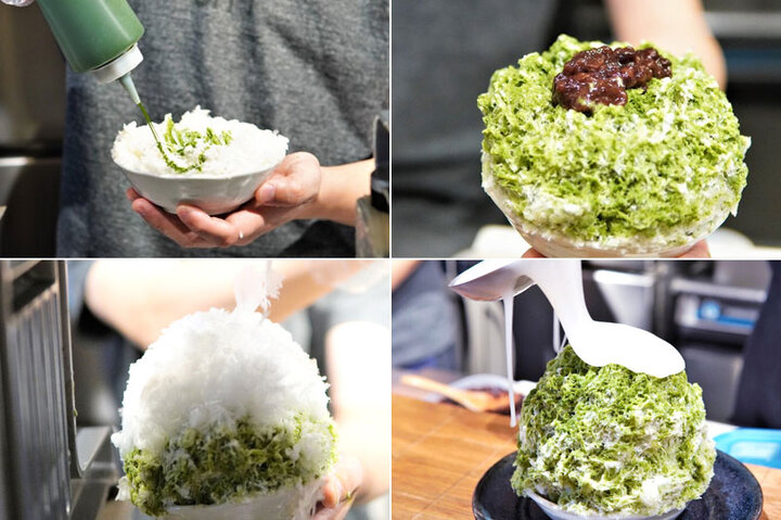(左上)内側にも抹茶シロップと特性練乳を丁寧にかける(右上)やわらかく煮た小豆もたっぷり(右下)お皿を器用に回して形を整えながら少しずつ削っていく(右下)仕上げは餅ソースのトッピング
