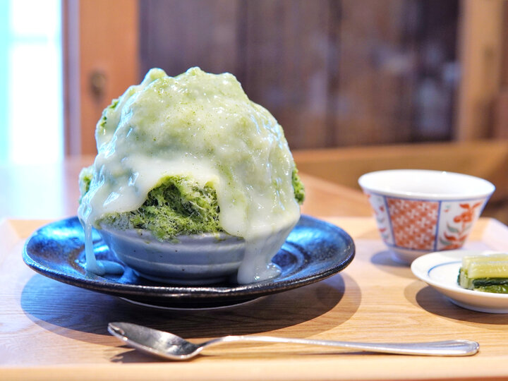 フルーツ系以外も抹茶やほうじ茶、ティラミス、黒蜜きなこなど充実したラインナップ。とくに抹茶は鹿児島の指定農園で有機栽培した茶葉を使うこだわりも。この茶葉から作る抹茶のシロップと特製練乳を交互にかけた中にあずきをたっぷり入れ、さらに氷を削って抹茶シロップをかけるとその上からお餅のソースをかけていきます。トロリとした伸びのいい餅ソースがふわふわの氷をやわらかく包み込む新しい食感です。 かき氷にはどの種類にもお口直しの長野県名物の野沢菜が付きます。温かいお茶と一緒にいただきながらゆっくりとくつろいでくださいね。