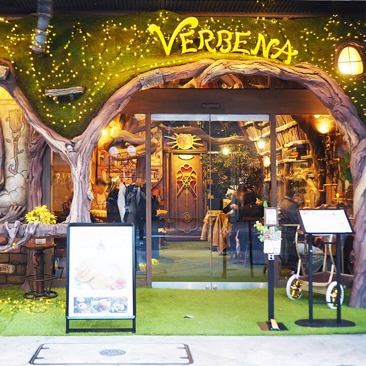 静岡駅から歩いて約15分。個性派揃いの名店が集まる「七間町名店街」の一角に、「魔法のティータイム VERBENA」はあります。 店名の「VERBENA」とは、スペイン語でいう「バーベナ」の花言葉「魔力」や「魅力」の意味。その言葉通り、大きな木の根っこが入口の扉をはうように囲い、訪れた人を魔法の世界へ誘います。