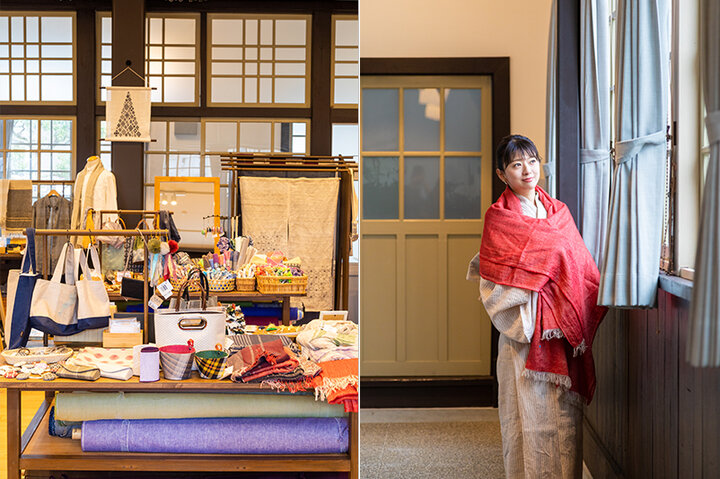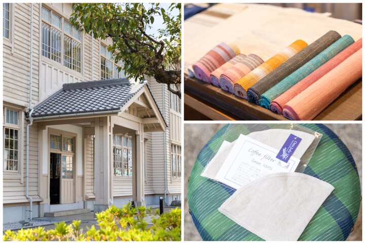 (左)夜はライトアップされて美しい外観、(右上)地機で織った手織生地、(右下)「麻コーヒーフィルター」1枚700円