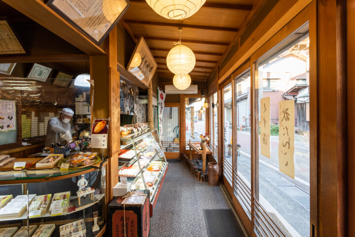 中山道沿いにて創業して157年。新作菓子も多数のアイデア溢れる5代目店主が、暖簾を守る老舗和菓子店です。月ごと季節ごとの上生菓子や餅菓子はもちろん、きな粉をまぶす餅菓子の「湖東三山」や葛羊羹の「びん細工てまり」といった愛荘町ならではのネーミングが気になる和菓子もあります。