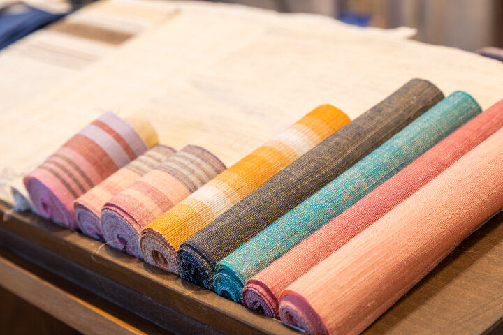 (左)店内には近江上布をはじめ様々な麻製品が並ぶ(右)麻の着物は涼しげで優しい色合い