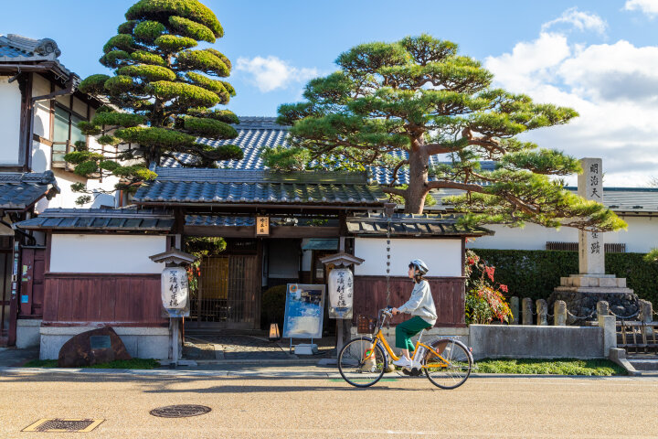 琵琶湖の東側、滋賀県の中央辺りに位置する滋賀県・愛荘町。町内にある近江鉄道愛知川駅からすぐのところに、江戸期の宿場町の面影を今に感じる中山道65番目の「愛知川宿」があります。旅籠や商人屋敷が軒を連ね、当時の面影が残りレトロな雰囲気。歴史を感じる老舗店など立ち寄りたいスポットも豊富なエリアです。のんびりと自転車にのってめぐってみませんか?