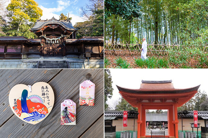 (左上)拝殿の奥にある本殿(右上)名だたる武将が軍旗にして勝利を収めたという勝運伝説の竹藪(右下)入母屋造り鎧(よろい)葺きで国の重要文化財の四脚門(左下)美人絵馬とお守り