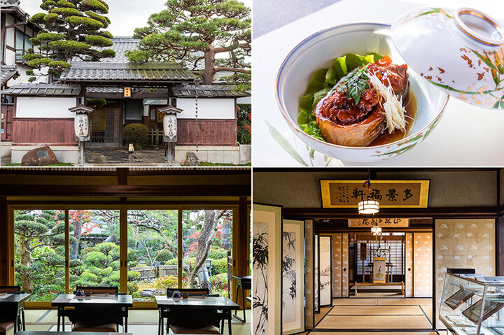 (左上)老舗ならではの重厚な店構え(右上)名物の鯉のあめ煮は、ひょうたん弁当にプラス1000円で付けることも(右下)明治天皇御巡幸時の玉座などを残す御在所(左下)湖国百選の庭を拝見しながら食事を
