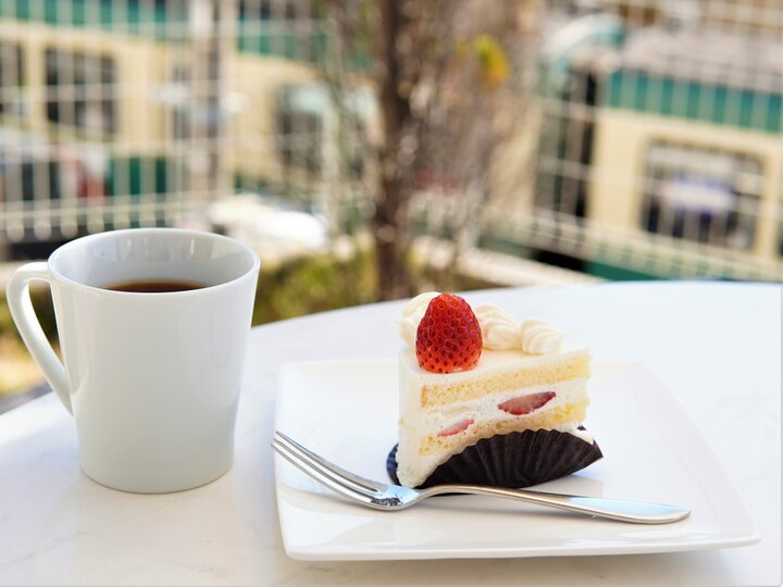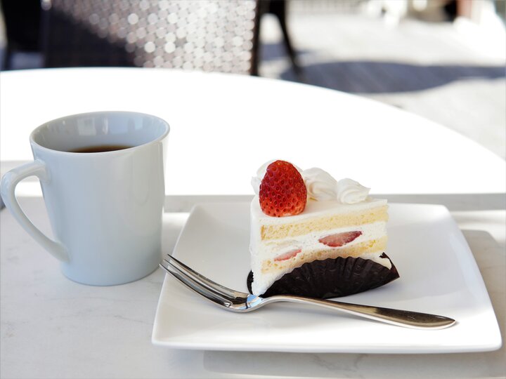 ケーキはどれもパティシエの力量が問われるようなシンプルなケーキで、コーヒークリームをやわらかいスポンジ生地で巻く「モカロール」(350円)や「シュークリーム」(350円)、フルーツのタルト類などオーソドックスなランナップ。それぞれに丁寧な手仕事がしっかりとほどこされ、なかでも「ショートケーキ」はなめらかな生クリームの美味しさが際立つしっとりとした味わいです。テラスの開放感も感じながらゆったりとした気分で楽しんで。