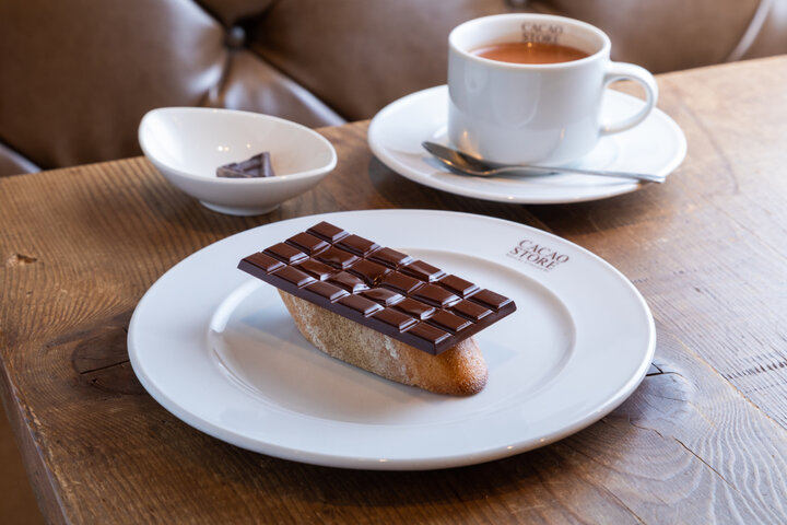 販売スペースのさらに奥へ進むと、カフェスペースがあります。ここではチョコレートはもちろん、ドリンクやケーキ、さらには軽めの食事もオーダー可能。注目は板チョコレート1枚をのせた「トーストショコラ」448円や「チョコレートカレー」1293円。 「トーストショコラ」はパリパリのバケットの上に板チョコが丸ごとのったもので、ほんのりあたたかく中央からとろけていく板チョコのおいしさと香りを存分に楽しめます。