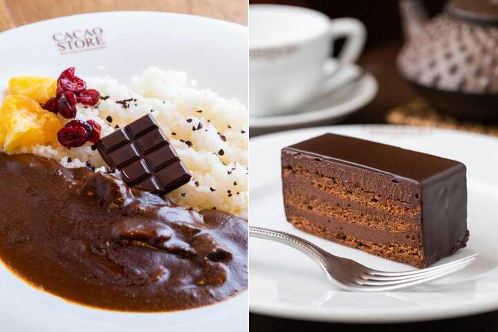 また「チョコレートカレー」は甘口か辛口か、さらにチョコレートをビターかミルクから選ぶことができ、板チョコがそのまま入ったインパクトある見た目ながら、コクのある味わい深い一皿。添えられたドライフルーツがアクセントになっています。 そのほかテオブロマの人気スペシャリテ「サンフォアキン ドス」もメニューに顔をのぞかせます。チョコレートクリームと、粉を使わないチョコレートのスポンジを7層に重ね上げた、しっとり濃厚なチョコレートケーキで、チョコレートの苦味や酸味、アロマ、奥深さが感じられます。