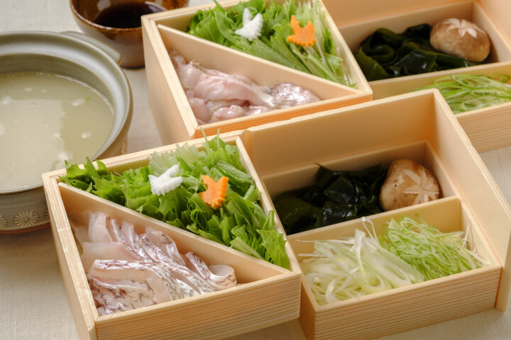 内容:のどぐろ、真鯛(各80g)、水菜、ネギ、椎茸、わかめ、自家製ポン酢、黄金スープ