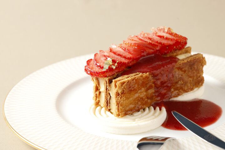 「季節のミルフィーユ イチゴ」は、店内で焼き上げたランヴェゼルタイプのパイ生地とバニラが香るクリームを合わせています。 苺には、「とちおとめ」「レッドパール」「章姫」のブランド苺を掛け合わせて生まれたスイーツ苺「いばらキッス」を使用しています。温かいソースと冷たいアイスのコントラストと一緒に楽しんで。