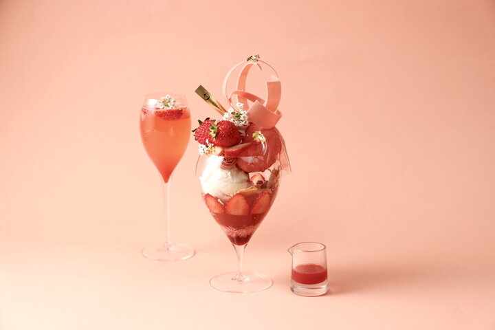 「イチゴガリ」は、まるでパフェの中でいちご狩りを楽しんでいるかのような、苺づくしの一品です。たっぷりの苺にサクサクのパイ生地を合わせています。 主役の苺は「いばらキッス」を使用。特製イチゴシロップにライムとローズマリーの香りが楽しめる、まるでお花畑のような香りの微炭酸オリジナルノンアルカクテルとのペアリングを楽しめますよ。