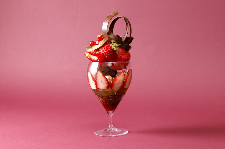 「ラブソディー」は、自由奔放な愛をテーマに、季節の苺と41%のオリジナルクーベルチュールを使ったショコラベリーパフェです。 濃厚なチョコレートに、ほんのり上品なラベンダーが香ります。別添えのショコラソースをかけて、とろける様な幸せな時間を過ごせます。