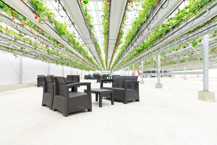 収穫したイチゴはソファに座って味わえる。食べ放題1時間2500円、アフタヌーンティー2時間3500円