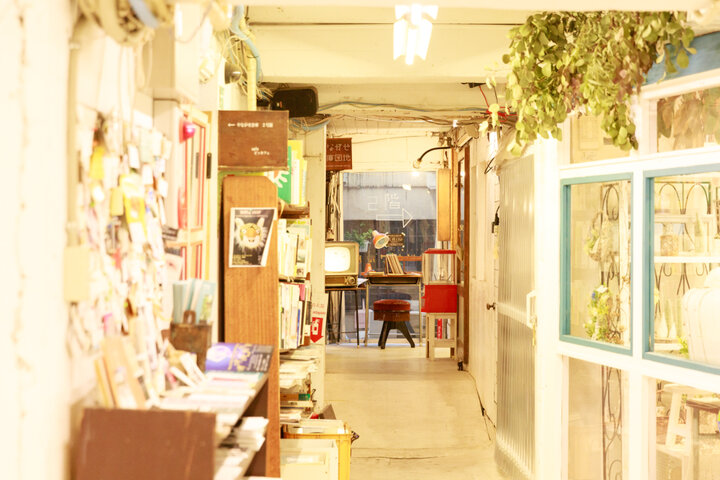 1959(昭和34)年築造の雑居ビルを、3代目オーナーが約17年前にDIYでリノベーションした「やながせ倉庫」。自由な店づくりが話題を呼び、カフェや古本屋、革工房、古着屋など、個性的な店やクリエイターが集まる場所になりました。細長い通路を歩き、宝探し気分でドアを開けましょう♪ 1階の「ビッカフェ」は、同ビルで古本屋を営むオーナーが手がけるカフェ。ギャラリー併設の店内ではライブやワークショップが随時開催され、イベントを行ったハンドメイド作家の作品もあちこちに飾られています。