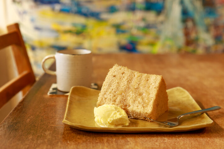 ビッカフェの手作りシフォンケーキセット600円。ビル屋上で養蜂し、集めたハチミツをたっぷりかけた。コーヒーは恵那市の人気カフェ「milou」の豆をドリップ