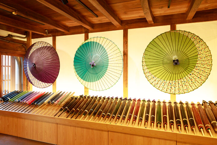 地元に残る5軒の和傘屋の作品が並ぶ。女性職人が手がけた色鮮やかな傘が人気。1本24200円~