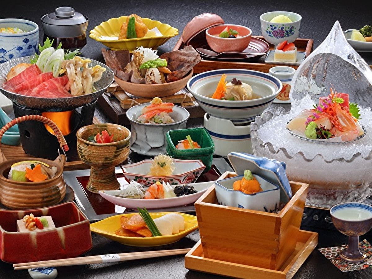 食事では、地のもの、旬のものを取り入れ、食材を最大限に生かし調理した、こだわりの料理が登場します。仙台牛や三陸のあわびなどの特選素材、地場野菜が楽しめるほか、さらに緑水亭の庭園で採れた、たけのこや季節の山菜が彩りを添えます。