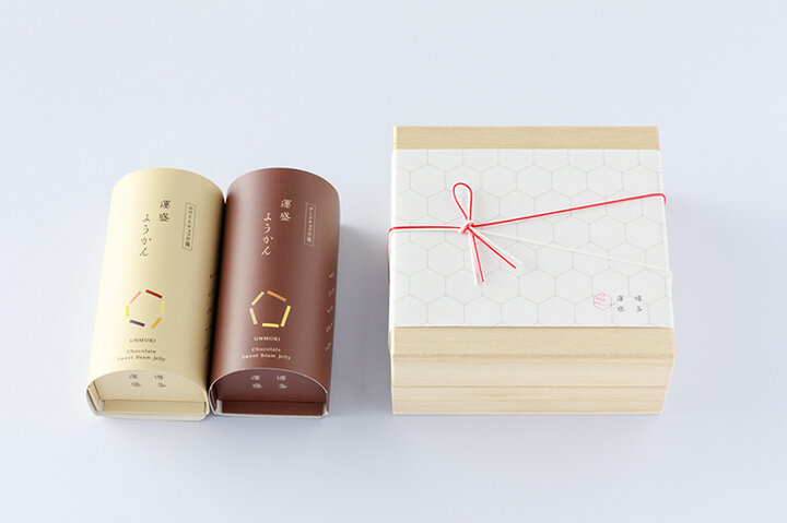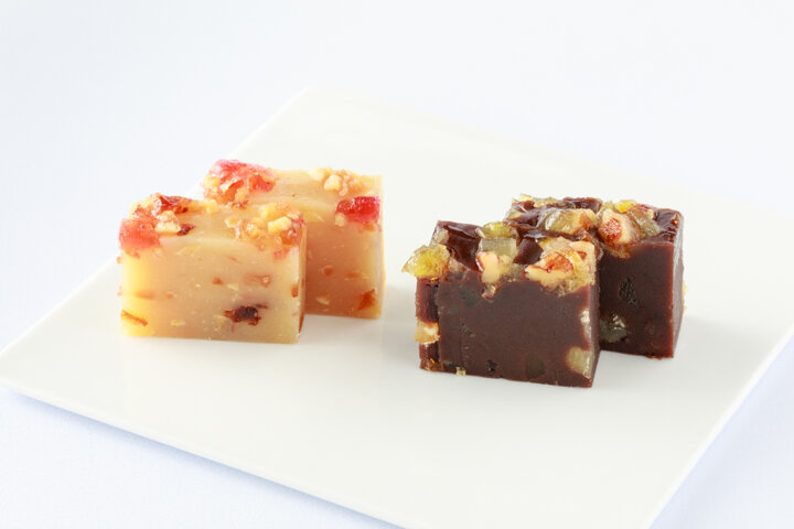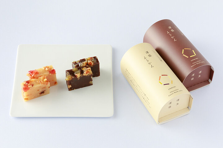 「運盛ようかん」は白と黒の2種が桐箱に収まった、贈答用にもぴったりな和菓子。 密度の高いなめらかなダークチョコレート入りの餡がベースの「黒」は、チョコレートのほろ苦さにスパイシーなジンジャーや酸味のあるいよかんがマッチ。ホワイトチョコレート入りの白餡にフルーツの色味が映える「白」は、餡のコクにフルーティーな柑橘の風味が広がります。 どちらも練り込まれたドライフルーツが異なるので、それぞれの餡と相性の良いフルーツの香りや甘さ、ナッツの食感と香ばしさなど、噛みしめるごとに多彩な味わいを楽しめます。