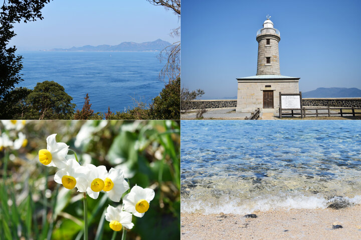 (左上・下)水仙郷の遊歩道からの眺めと可憐に咲く水仙の花 (右上)どっしりした石造りの男木島灯台 (右下)灯台横の浜辺