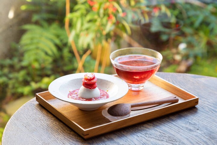 カフェのコンセプトから、特定のメニューが長く提供されるということは少ないそうですが、そのなかでも比較的長期間にわたって味わえるのが苺大福。 「主役である苺が、大福の中に隠れているなんてもったいない」という素朴な疑問から考案されたスイーツです。スープには、甘味の強い「あまおう」と酸味と香りに優れている「恋みのり」の2種の苺が使われています。大福の生地には卵白が混ぜ込んであり、中には白あんが。そのため白さが際立ち、苺の赤との対比が印象的です。 こちらは、トッピングに使われている柚子の季節が終わる3月上旬頃まで楽しむことができます。