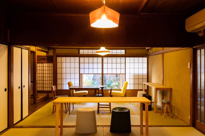町家は「織屋建」という造りで、かつては西陣織の工房でした。土間で靴を脱ぎ部屋に入ると、心地よさそうな空間が広がっています。ゲストハウスのロビーとして利用されていますが、ときにはこちらで食事をする方もいるそう。