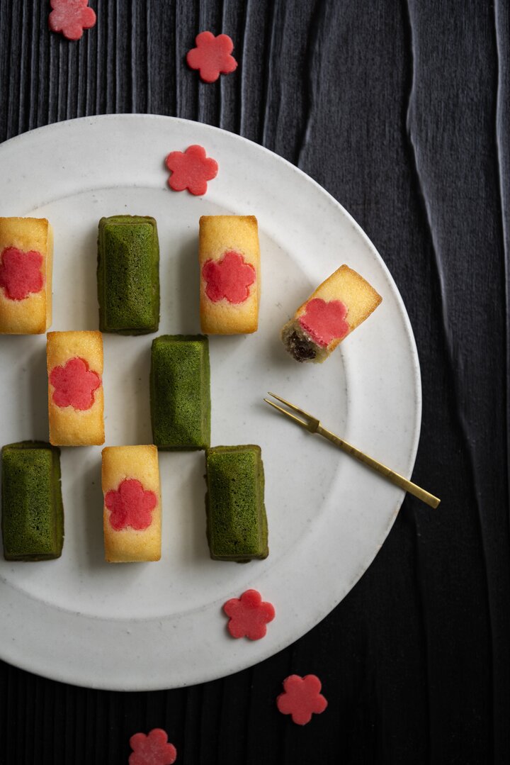 「anフィナンシェ 花 / 抹茶」は、バターをたっぷり使用したしっとり一口サイズのフィナンシェに、京菓子處鼓月で使用する大納言小豆餡を入れています。 プレーンの表面には上生菓子で使用される「こなし」で、季節の柄があしらわれています。