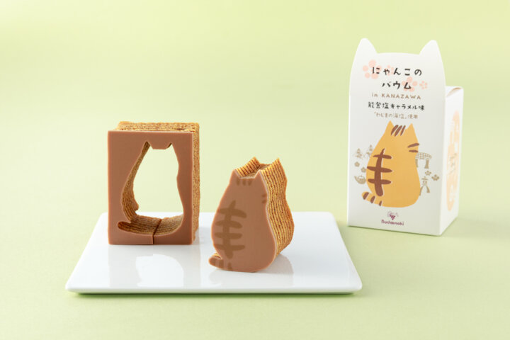猫の日に誕生した「にゃんこのバウム」。金沢の洋菓子店「ぶどうの木」が地元らしさを感じるお菓子をと開発した見た目も楽しいスイーツです。 この猫の名前は、トラ(9歳)。辛い過去を乗り越え、今では「仏(ホトケ)」と呼ばれているトラが金沢の街を見下ろす姿をモチーフにしたのだそう。 しっとりとしたキャラメル生地は、ほろ苦い大人の甘さ。素材の旨みを引き出すと言われる能登の塩「わじまの海塩」をアクセントに、甘さとまろやかな塩味がほどよく同居しています。