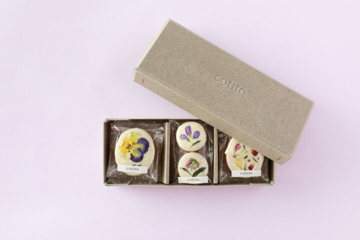 箱を開けると、思わずかわいいと声が出てしまいそうな花のサブレが並びます。エディブルフラワーを広げてホワイトチョコの上にのせています。閉店前に売れ切れてしまうこともある人気のお菓子です。 丁寧に焼きあげられたサブレはさっくりと軽い口あたりで、素朴でこころがほぐれるやさしい甘さ。『cotito』の焼菓子は卵・乳製品を不使用で、安心していただくことができるので贈り物にもおすすめです(ホワイトチョコは乳製品を使用)。カフェの隣にある花屋内でお菓子を販売しており、不定期で開催するオンラインでも購入ができるので、HPをチェックしてみてくださいね。