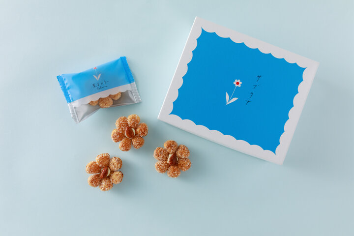 一輪の花がシンプルに描かれた水色のパッケージ。開けると、かわいい!とつぶやいてしまうような花の形をしたお菓子が現れます。 袋を開けた瞬間に漂うバターの香りは、口に入れると一層まろやかに。パイ生地が薄く折り重なった軽い口当たりに、表面にまぶされたザラメ糖がシャリッと甘さを加えます。真ん中のアーモンドの香ばしさと甘いクリームもアクセント。使っているバターは、フランスのシャラント地方で作られたトップクラスのものにこだわっています。ま