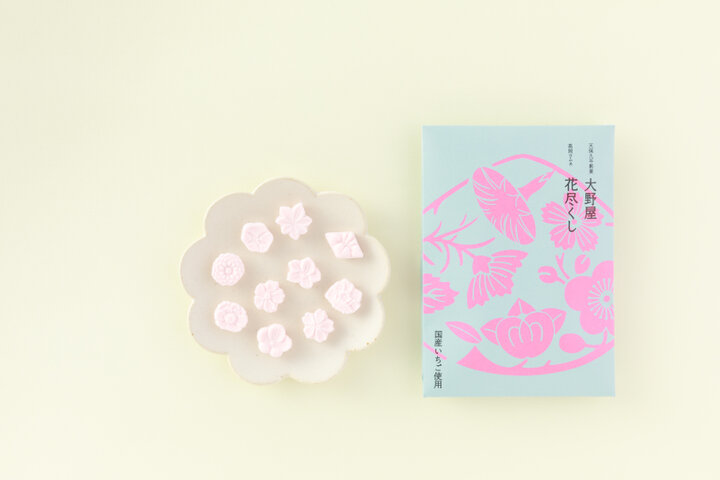 紙モノ雑貨のような美しいイラストがデザインされた「高岡ラムネ」。開けてみると和菓子の落雁のように凹凸のある小粒の花型が並んでいてます。その細やかな美しさは、駄菓子のラムネのイメージとは異なる品。ひと粒をそっと取って口に運ぶと、ほのかな清涼感を伴う苺の甘酸っぱい味わいがスゥーッと優しく溶けていきます。 落雁のようなこの美しい形は、和菓子の木型を使って和菓子職人による手作りにより実現しているそう。優しい味わいは、一般的に駄菓子のラムネに使われているコーンスターチや人口香料の代わりとして、富山県産コシヒカリの米粉や国産の天然素材を使っての味付けによるものです。