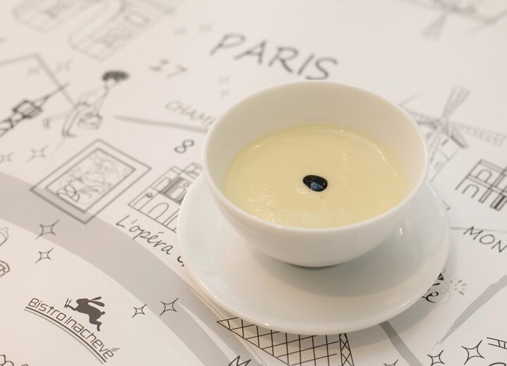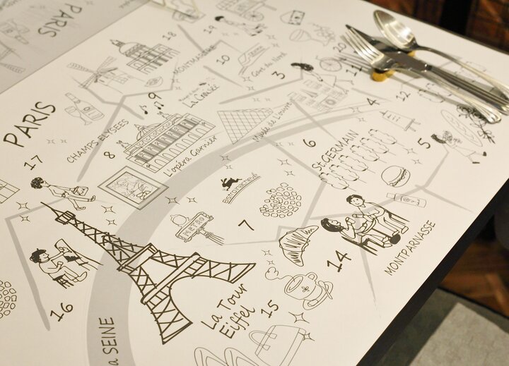 店内はおひとり様用のカウンター席や個室もあるカジュアルモダンなインテリア。席に座るとパリの街をモチーフにしたランチョンペーパーが敷かれ、ビストロの雰囲気たっぷりです。お店のアイコンがウサギとなっていて、看板はもちろん、店内や器、料理など、いろいろなところで見つけることができます。