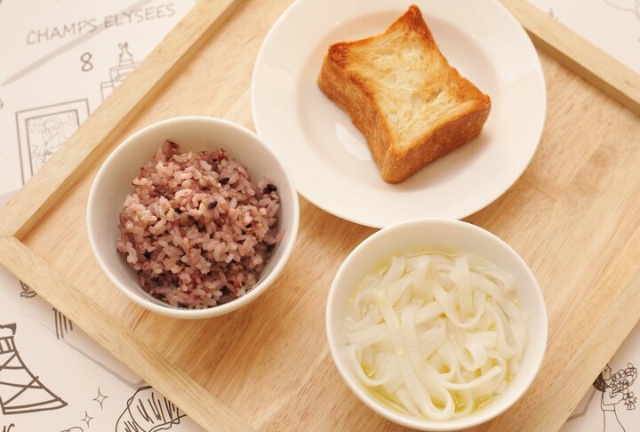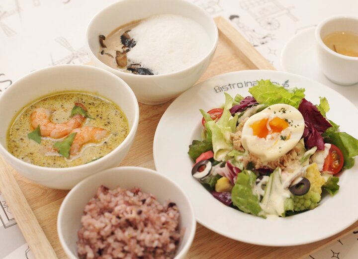 4つのスープから2種類が選べるようになっている、スープセット。グリーンカレー風や茸の旨味が凝縮したスープなど多彩な味わいと香りで楽しませてくれます。パンとサラダ、ハーブティーがセットになっていますが、パンは名古屋の人気ベーカリー、テーラテールのもの。ほかにキヌアライスやライスヌードルを選ぶこともでき、健康や美容が気になる人も安心して楽しむことができます。