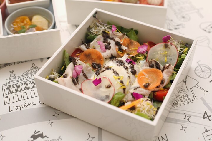 最後に出てくるのが真っ白な三段重。一の重は色鮮やかな季節のサラダです。春はリサイクルポークを使った自家製ハムと温泉玉子をのせたトリュフ&オリーブのドレッシングが香るご馳走サラダ。 リサイクルポークとはパン工場で規格外や余剰となったパンを飼料として再利用して与えた豚のことで、エコフィードと呼ばれる資源の有効活用しながら美味しいお肉を生産する取り組み。イナシュヴェでは愛知県豊田市の「トヨタファーム」のリサイクルポークを使用しています。