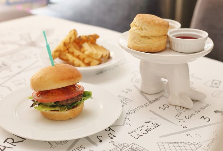 続いて軽食が並びますがこちらは、バーガーまたはミニカレーがチョイスでき、アフタヌーンティーの定番であるスコーンやフレンチフライも付いてボリュームたっぷり。カレーは酒井シェフがプロデュースしたカレー専門店で人気の牛スジカレーです。平日は11時からオーダーな可能なので、ランチとして楽しむ人も多いそうですよ。